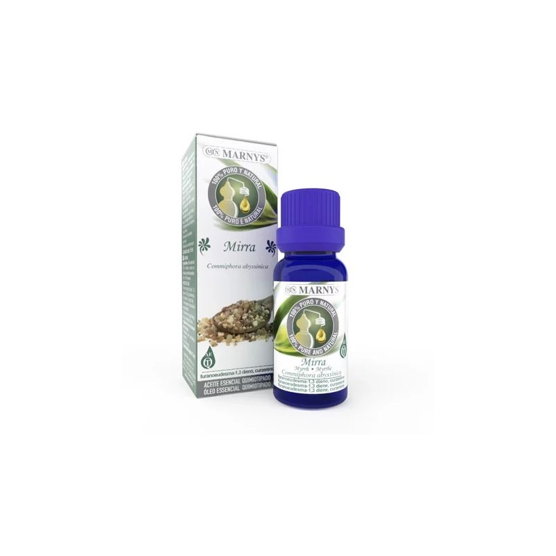 El Aceite Esencial de Mirra MARNYS® es 100% puro y quimiotipado, es decir, tiene una composición definida y es 100% de origen natural. La Mirra se ha obtenido por destilación por arrastre de vapor de agua y no ha sido desnaturalizado ni mezclado con otros aceites, lo que asegura las propiedades del aceite esencial.