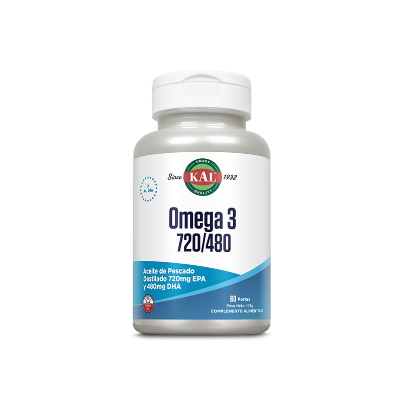 Complemento alimenticio. El Omega 3 720/480 de KAL procede de pescados salvajes de aguas frías. Este Omega 3 pasa por un proceso de destilación y purificación que incluye la destilación molecular, para eliminar los metales pesados, PBCs, dioxinas, furanos y otros contaminantes. Dos perlas contienen 720mg de EPA y 480 de DHAComposición de OMEGA 3 720/480 - 60 PERLAS