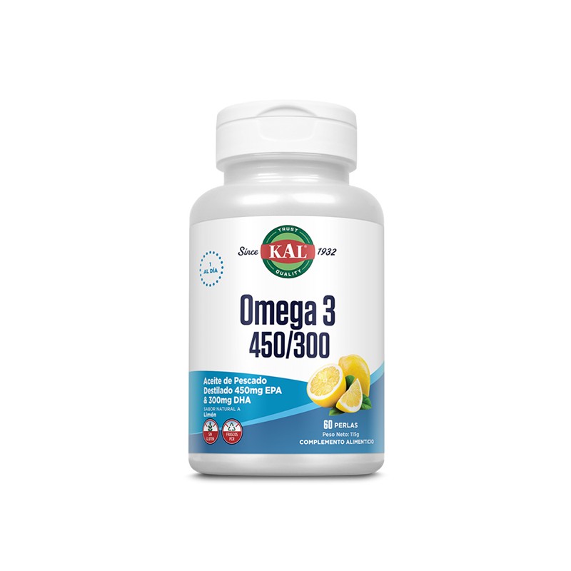 Complemento alimenticio. El Omega 3 450/300 de KAL procede de pescados salvajes de aguas frías. Pasa por un proceso de destilación y purificación, que incluye la destilación molecular, para eliminar metales pesados, PCBs, dioxinas, furanos y otros contaminantes. Cada perla contiene 450mg EPA y 300mg DHA. El aceite de limón natural aporta un agradable sabor final.Composición de OMEGA 3 450/300 - 60 Perlas