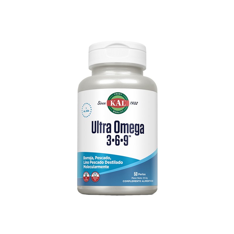 Ultra Omega 3-6-9 de Kal es un complemento nutricional que aporta ácidos grasos esenciales fundamentales para la salud del organismo.