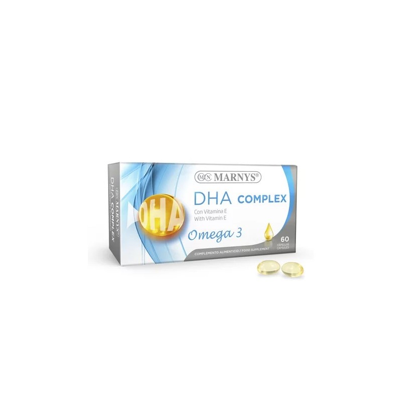 MARNYS® DHA Complex es un complemento alimenticio elaborado en cápsulas blandas a base de Aceite de Pescado con 50% de contenido de DHA (250 mg) que mantiene el normal funcionamiento mental y visual, además enriquecido con vitamina E natural. DHA Complex también contiene un 12% del Omega 3 EPA (60mg).