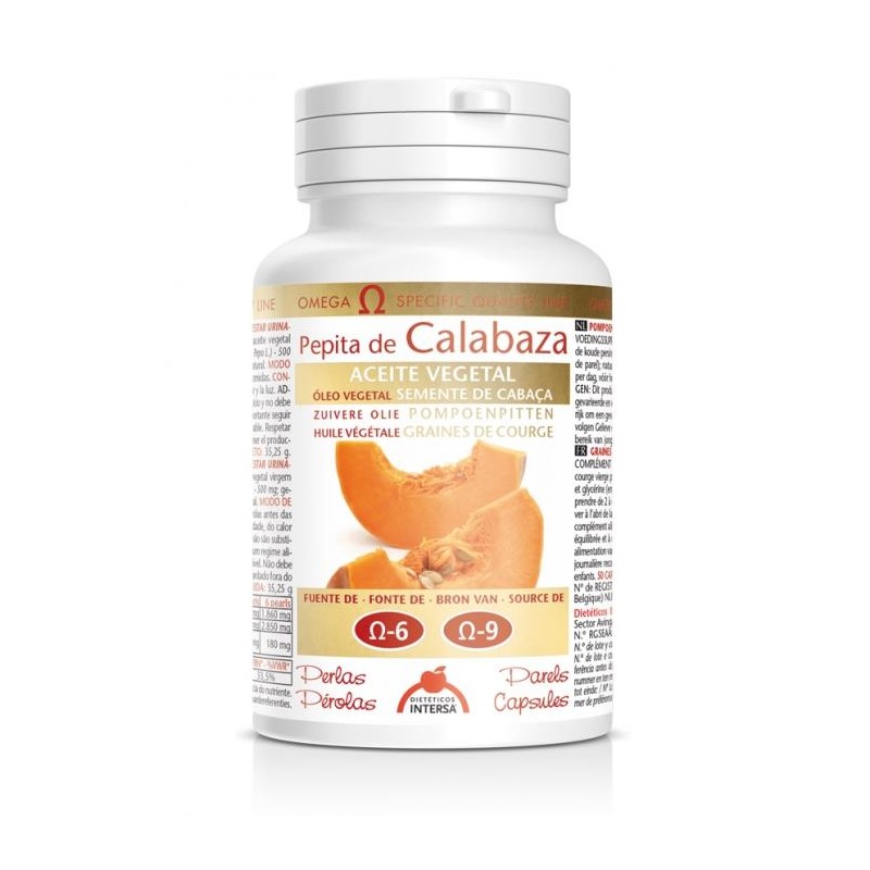 Suplemento alimenticio a base de aceite de pepitas de calabaza rico en ácidos grasos Omega 3, 6 y 9.