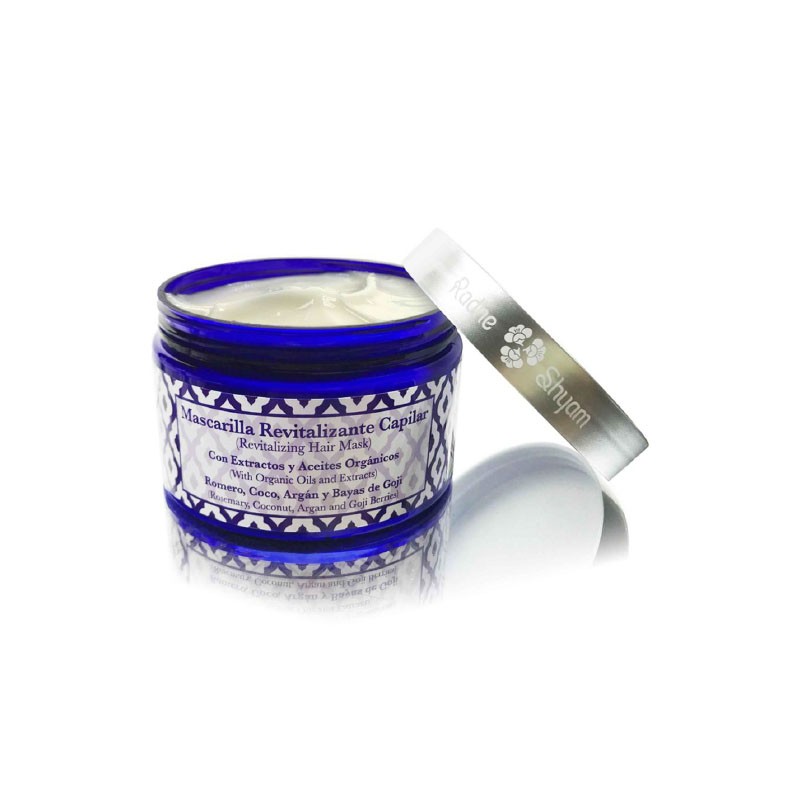 Mascarilla capilar revitalizante con extractos y aceites orgánicos de romero, coco, argán y bayas de goji.