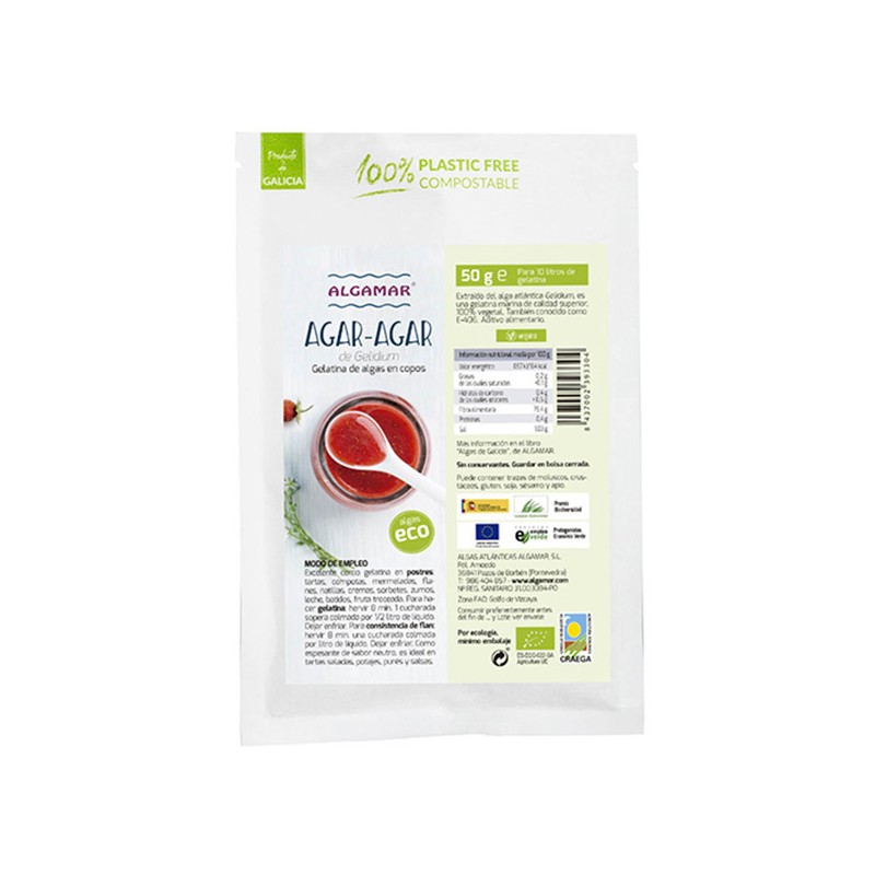 Agar-agar, gelatina de algas en copos, extraído del alga atlántica Gelidium, es una gelatina marina de calidad superior, 100% vegetal.