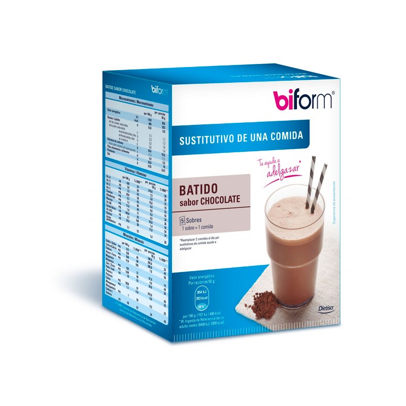 Batido hipocalórico sabor chocolate, sustitutivo de una comida para el control de peso. 1 sobre = 1 comida completa sólo 203 kcal.