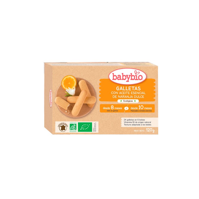 Galletas de dentición con sabor a naranja para peques desde los 8 hasta los 10 meses de edad . Su forma y textura han sido especialmente diseñadas para las pequeñas manos de los bebes. Babybio selecciona cuidadosamente sus ingredientes,