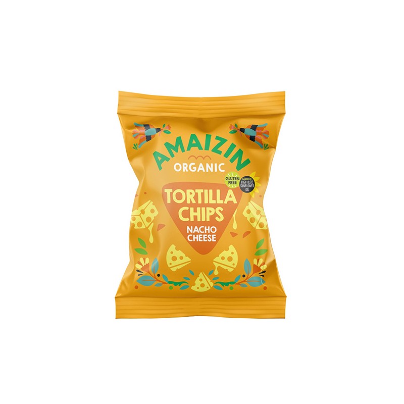 Auténticos Chips de maíz con queso, a partir de una receta mexicana original elaborada con el mejor maíz orgánico europeo, libre de transgénicos. Irresistiblemente sazonada con queso, frito en aceite de girasol alto oleico con gran contenido en grasas no saturadas. Sin gluten, orgánico, adecuado para los vegetarianos, libre de OGM, sin aceite de palma.