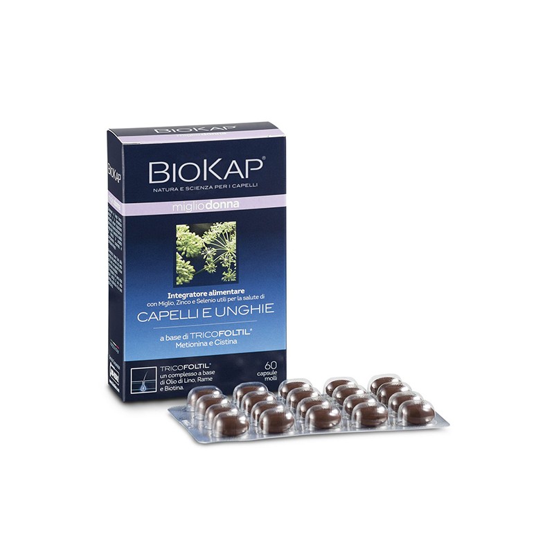 Biokap® Miglio Donna Tricofoltil® es un complemento alimenticio formulado específicamente para mujeres, contiene Tricofoltil®, un complejo rico a base de aceite de linaza en ácido alfa-rinológico. Está enriquecido con cobre que contribuye a la pigmentación natural del cabello y con biotina que contribuye a mantener el cabello natural. La formulación también incluye metionina, cistina, mijo y fitoextractos de soja, ricos en isoflavonas, y otros componentes como el equisetum, zinc y selenio, que contribuyen a fortalecer las uñas y el cabello.