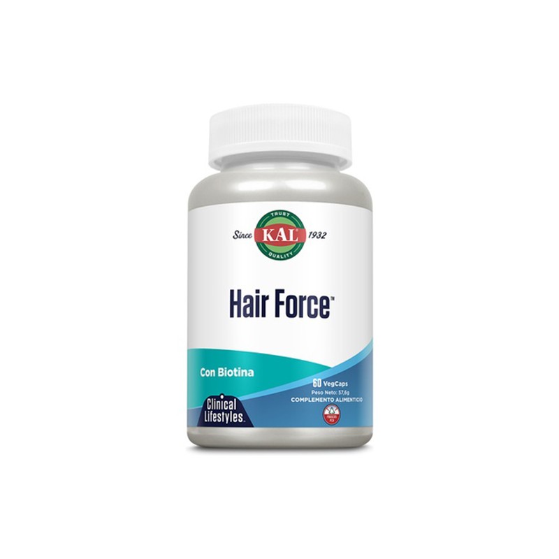 Hair Force de Kal aporta biotina cuyo uso en forma de complemento de la dieta, como en estas cápsulas, es la única forma en la que tiene capacidad para frenar la caída del cabello y reforzarlo. Las cápsulas de Hair Force también contienen MSM (metilsulfonilmetano), sabal, y centella asiática, además de aminoácidos azufrados, vitaminas y minerales específicos para nutrir el cabello y evitar su debilitamiento.Composición de FORCE HAIR 60 Caps.