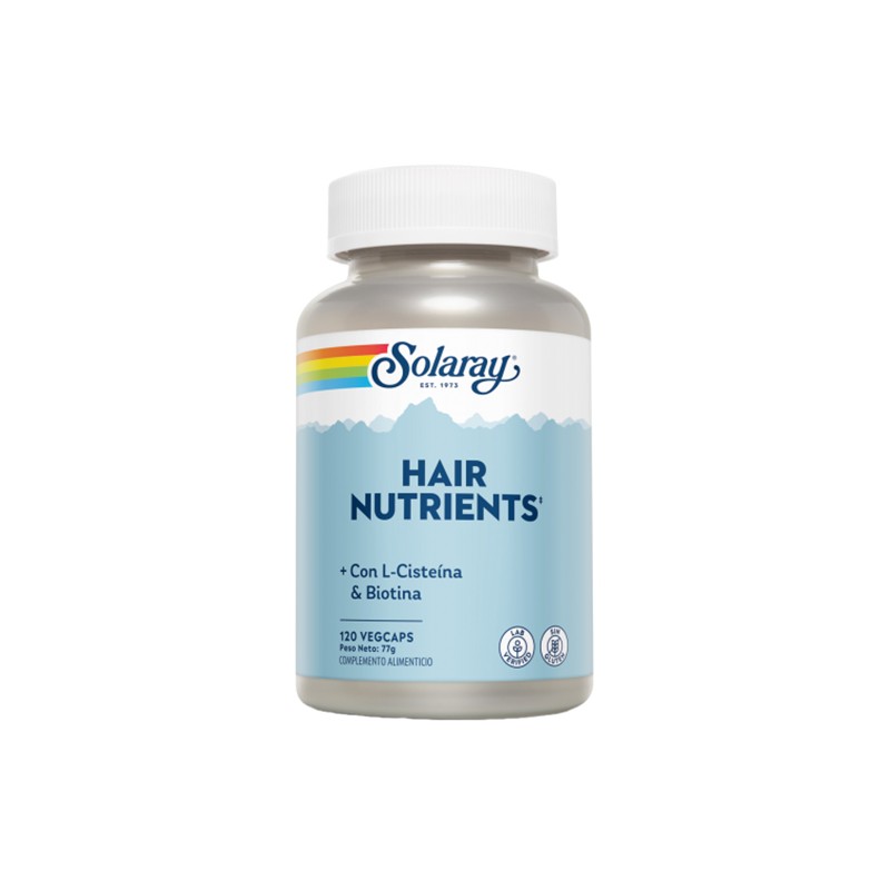 Hair Nutrients de Solaray es una combinación de vitaminas, minerales y hierbas destinados a evitar la caída del cabello, fortalecerlo y favorecer su crecimiento. Contiene L- Cisteína, componente importante para la síntesis de la queratina, una proteína que forma parte de la estructura de la piel, el pelo y las uñas.