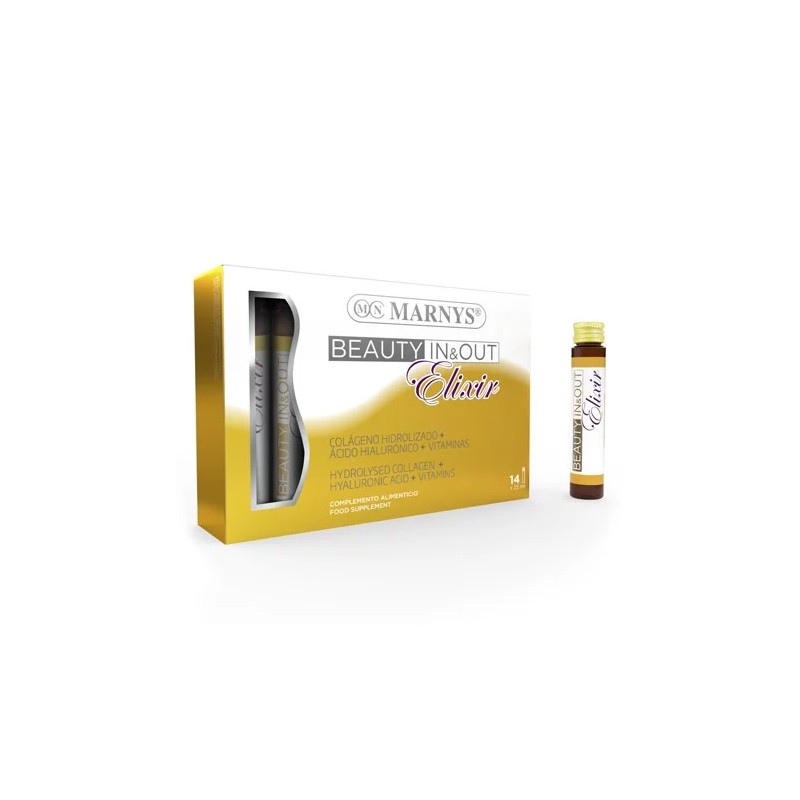 MARNYS® Beauty In & Out Elixir es un complemento alimenticio de nutricosmética bebible. Su exclusiva fórmula aporta una elevada concentración de Colágeno Hidrolizado Tipo I (5 g por vial), Ácido Hialurónico, Semillas de Uva (95% OPCs), Complejo Vitamínico B, Vitaminas A, C y E, y minerales. Gracias a su alta biodisponibilidad y la sinergia de sus ingredientes aporta nutrientes para la textura de la piel y su aspecto joven.