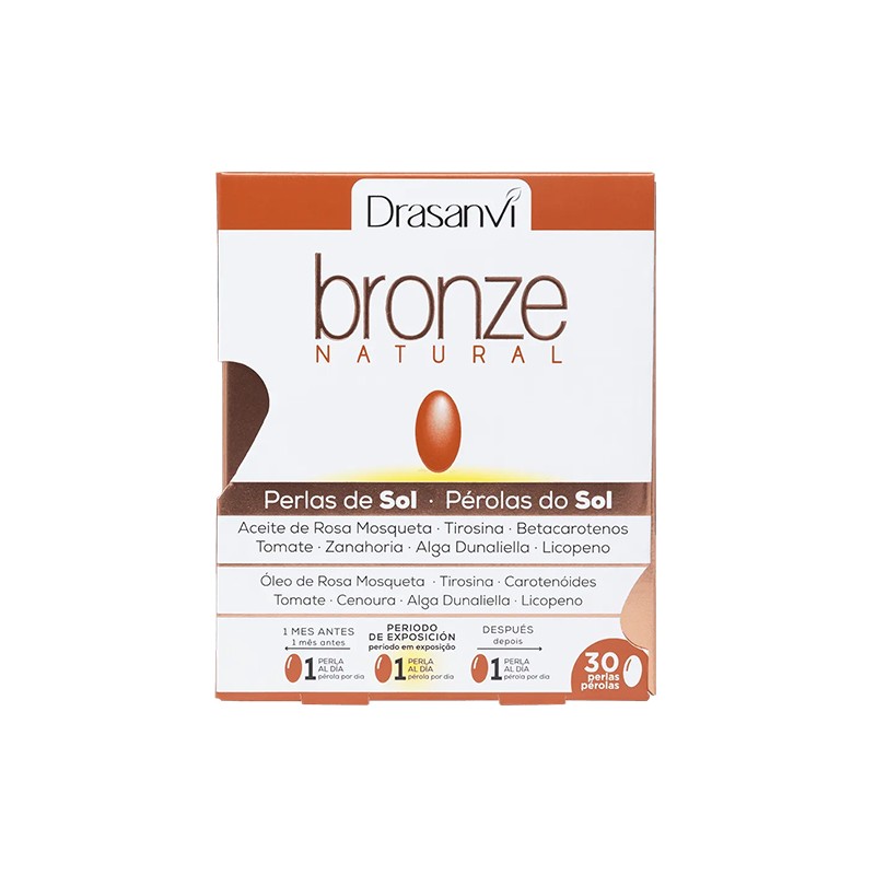 Bronze Natural es un complemento alimenticio a base de aceite de Rosa de Mosqueta, rica en ácidos grasos esenciales, extracto seco de Tomate, Zanahoria y Alga Dunaliella, extractos ricos en pigmentos como el Licopeno, Betacarotenos y Luteína.