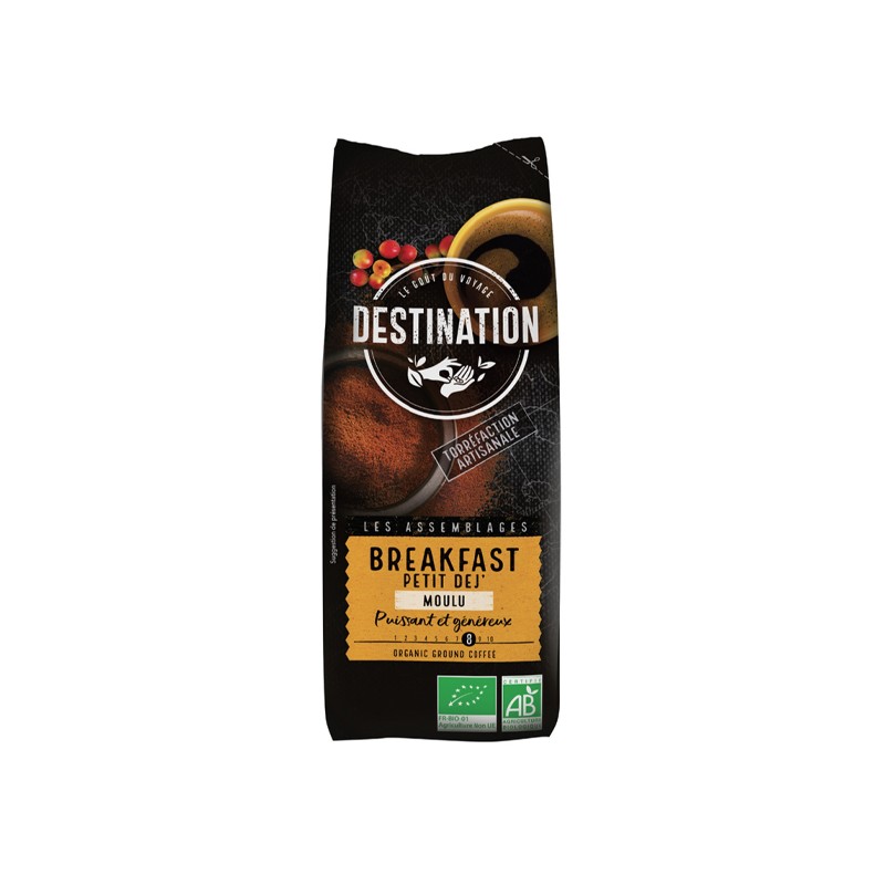Desayuno molido El desayuno de Destination Bio es ideal para un desayuno estimulante, este café de cultivo ecológico es potente y generoso. Con sus notas ligeramente amaderadas y su cuerpo suave, te hará comenzar el día con estilo.