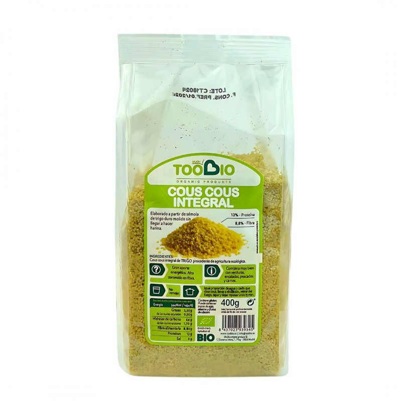 cous cous integral de trigo procedente de agricultura ecológica.Composición de Cous cous integral bio 400 grs.