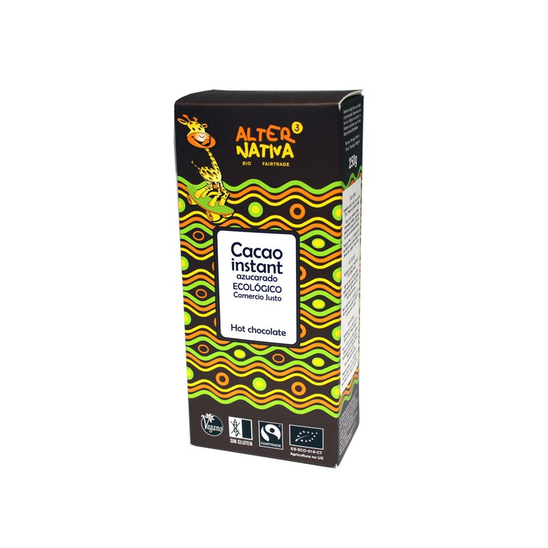 Exquisito cacao instantáneo ecológico. Sus ingredientes han sido cultivados en armonía con la Naturaleza, utilizando técnicas tradicionales, sin agroquímicos. De disolución inmediata tanto en leche fría como caliente.