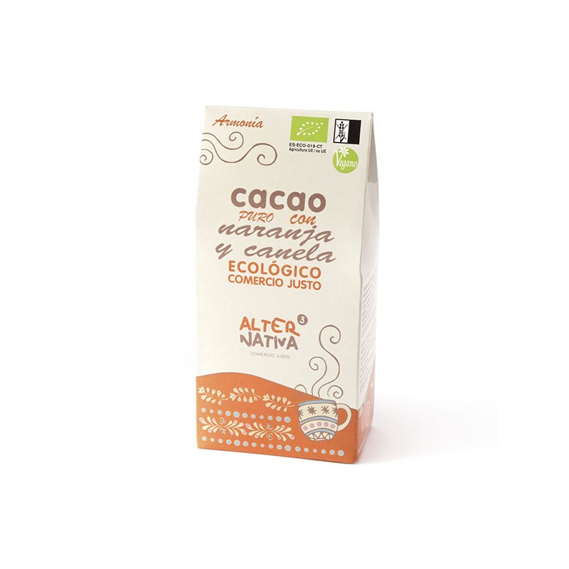Cacao puro con naranjar y canela. El contraste de la dulce canela con la fresca acidez de la naranja aporta a este cacao un sorprendente e intenso sabor y un profundo aroma. Estimulante y reparador, este cacao es un placer para el paladar gracias a la armonía de sus ingrediente