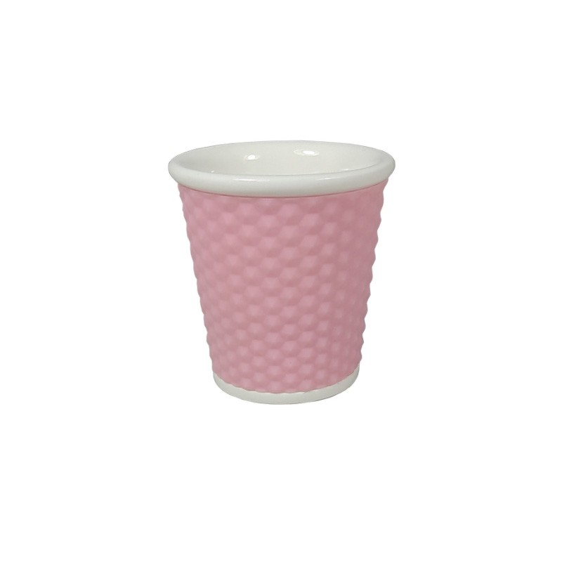 Taza de cerámica con banda de silicona en color rosa que evita la transmisión del calor. Libre de cadmio y de plomo. Fabricadas con porcelana de alta calidad ideal para café solo o cortado.