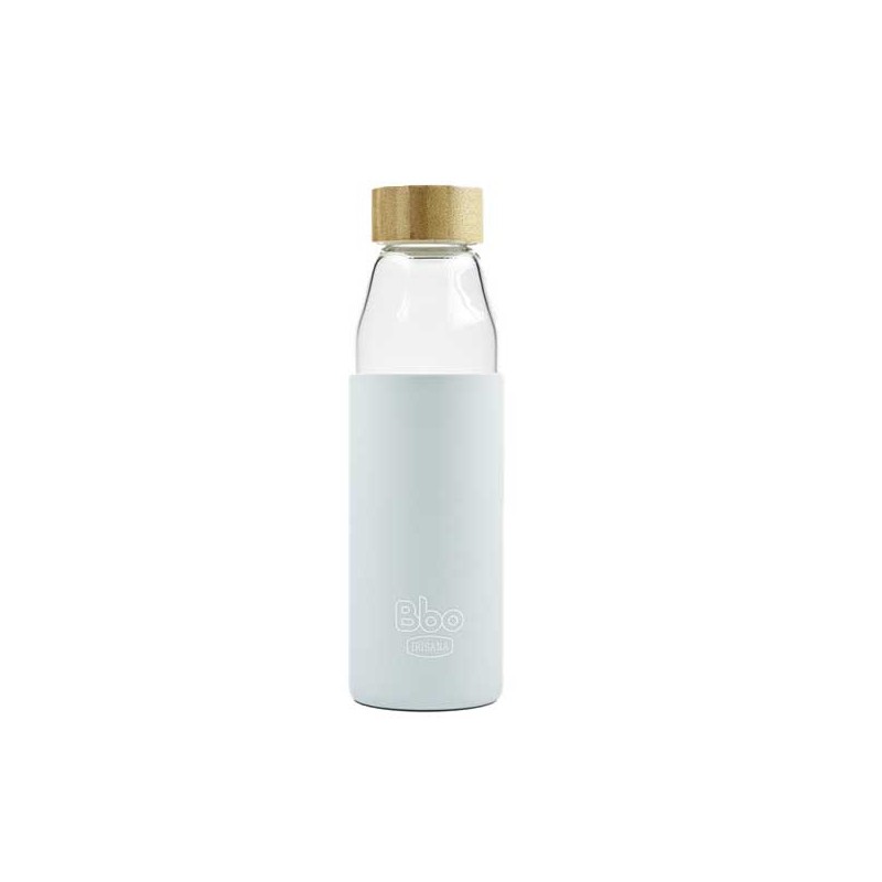 Botella de borosilicato. libre de BPA y Ftalatos. Con funda de silicona y tapón de bambú con junta de silicona de grado alimentario.