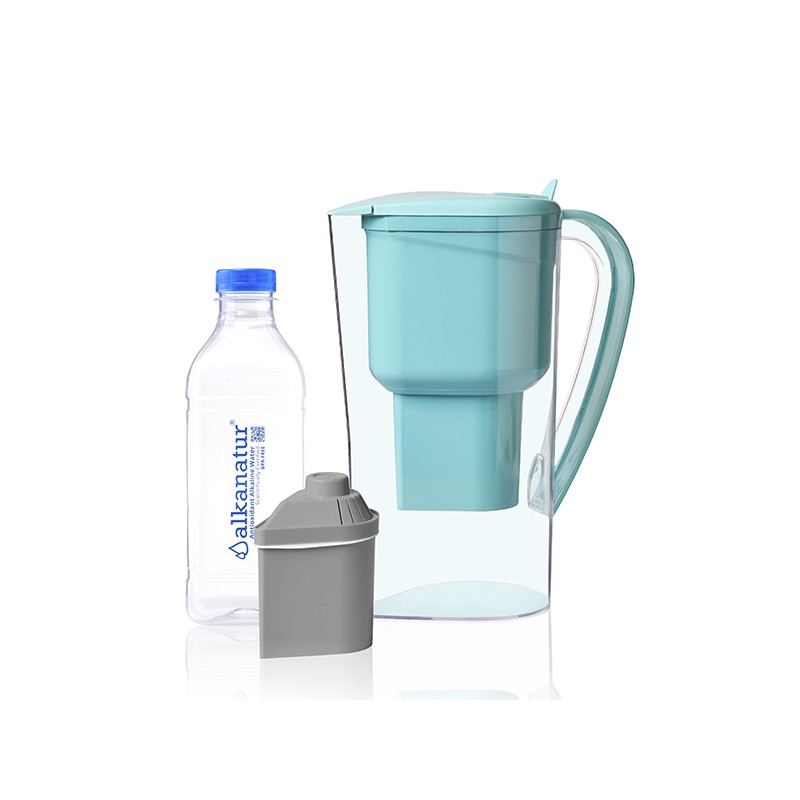 Jarra para alcalinizar e ionizar el agua que, aparte de filtrar partículas nocivas para la salud, alcaliniza el agua hasta un nivel de pH de 9,5 (dependiendo del agua utilizada) y la ioniza con un potencial de reducción oxidación de hasta -200 MV.