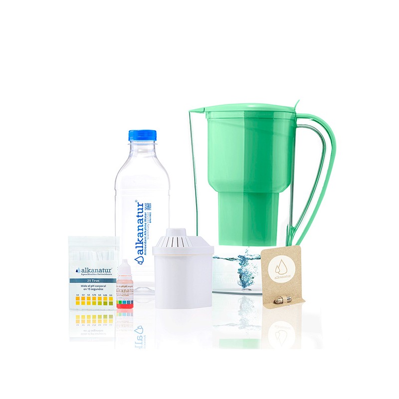 Jarra para alcalinizar e ionizar el agua que, aparte de filtrar partículas nocivas para la salud, alcaliniza el agua hasta un nivel de pH de 9,5 (dependiendo del agua utilizada) y la ioniza con un potencial de reducción oxidación de hasta -200 MV.