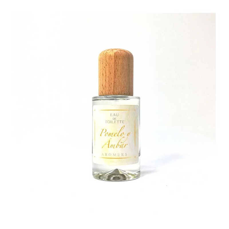 Eau de Toilette con aroma a pomelo y ámbar, con spray y tapón de madera.