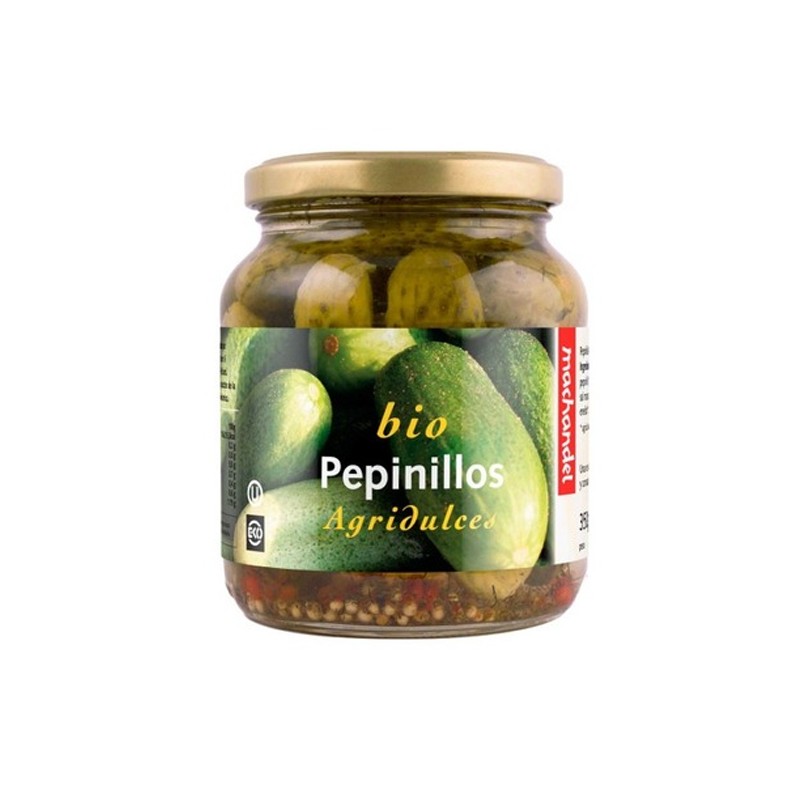 Pepinillos agridulces ecológicos en tarro. Elaboración artesanal de productos procedentes de agricultura ecológica-dinámica. Producción con fuentes de energía natural. Electricidad limpia, energía solar, eólica e hidráulica.