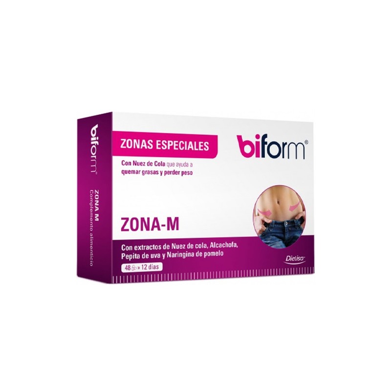 Biform zona m cuidado de la silueta de Dietisa es un complemento alimenticio a base de fibra de avena, nuez de cola, alcachofa, Citrus paridisi (naringina de pomelo) y pepita de uva, que ayuda a quemar grasa y perder volumen corporal.