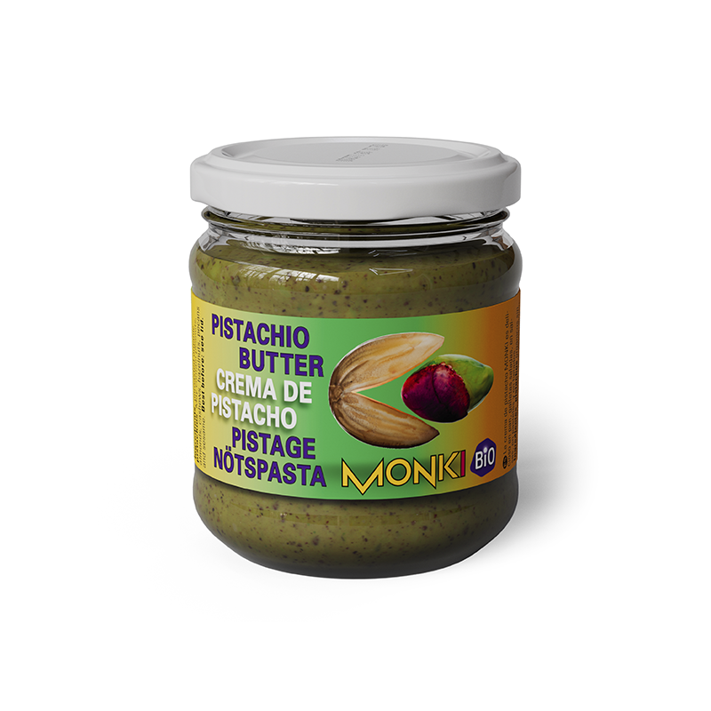 El pistacho ¿Quién no conoce este delicioso manjar verde en cáscara dura? Esta exclusiva nuez ahora pertenece a la familia Monki. En su propia fábrica trituran los mejores pistachos españoles hasta obtener la pasta de frutos secos más deliciosa. Con su textura suave y cremosa y su sutil sabor a nuez, la crema de pistacho Monki se puede utilizar en una amplia variedad de recetas, desde helados hasta aperitivos salados.