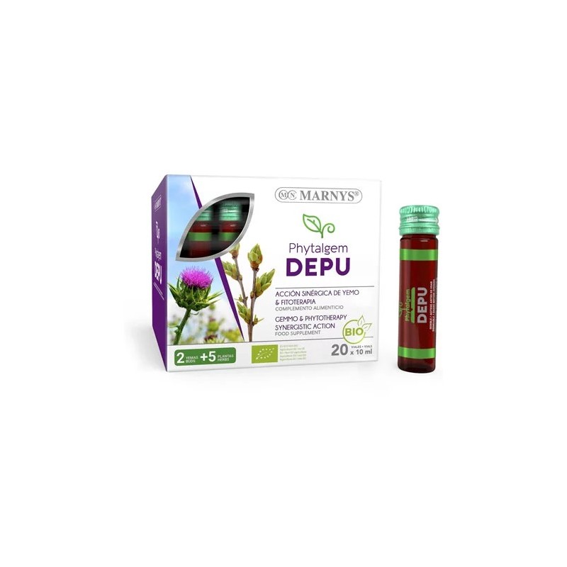 MARNYS® Phytalgem Depu constituye una magnífica opción para el organismo ya que está elaborado con extractos de plantas y yemas con propiedades purificadoras debido a los brotes jóvenes y de origen orgánico de enebro y romero, el extracto seco de cardo mariano, y los concentrados fluidos de diente de león y alcachofa.