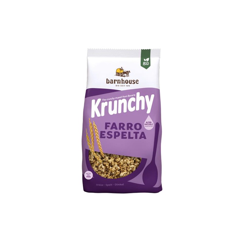 La granola de espelta de Barnhouse es un muesli de espelta ecológico crujiente. Endulzado de manera diferente. Sin trigo Ligero y crujiente. Al horno con aceite de giraso