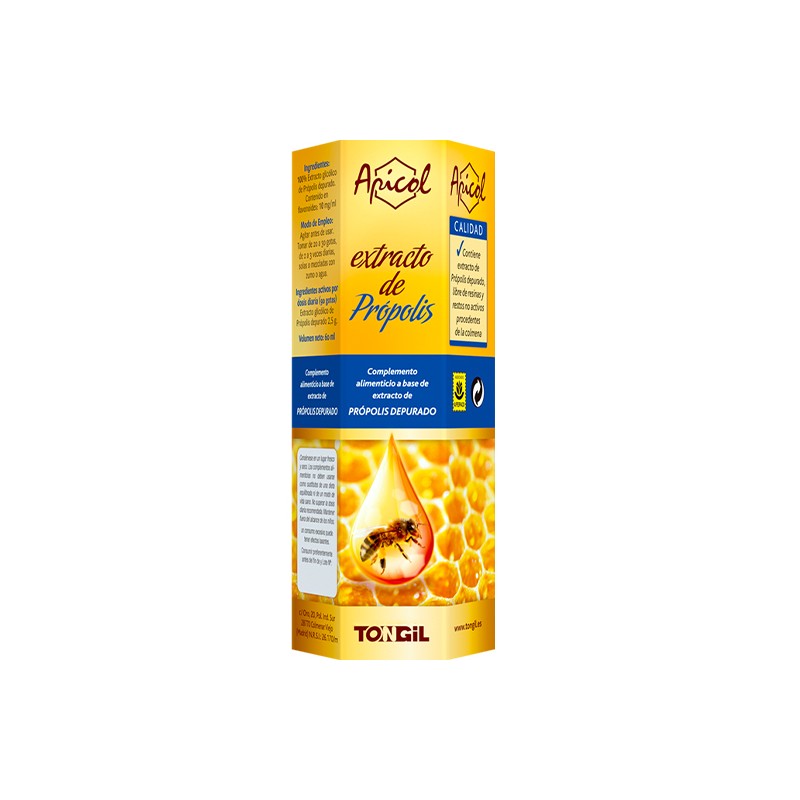 100% puro extracto glicólico de Própolis, estandarizado en flavonoides (10 mg/ml de flavonoides). Contiene extracto de Própolis depurado, libre de resinas y restos no activos procedentes de la colmena. Sin alcohol.Composición de Apicol extracto de própolis 60 ml