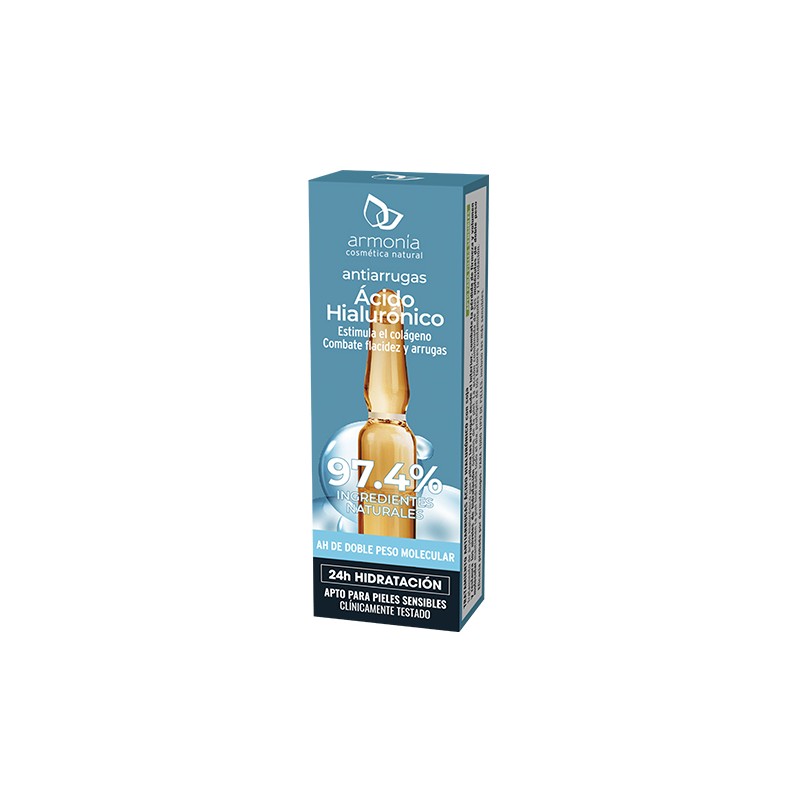 Con el paso del tiempo el ácido hialurónico naturalmente presente en nuestra piel se va degradando y se sintetiza en menor cantidad, dando lugar a los primeros signos de envejecimiento (líneas de expresión, arrugas…). Las ampollas de Ácido Hialurónico de Armonía, con doble acción antiarrugas, mejoran la elasticidad de la piel y restauran los daños producidos por la oxidación.