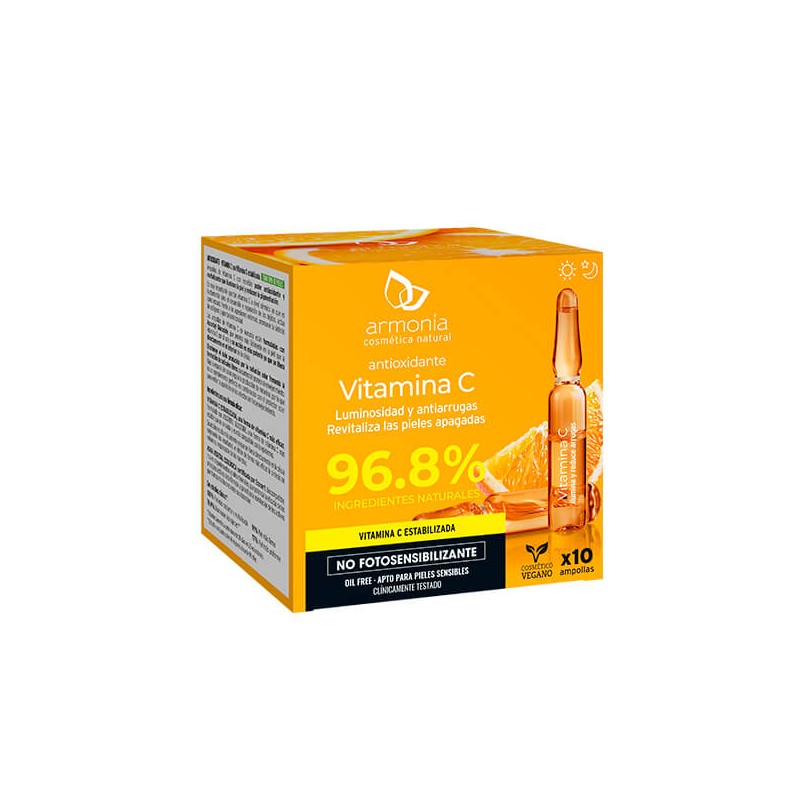 Las ampollas de vitamina C de Armonía están formuladas con Ascorbyl Glucoside, que penetra más fácilmente en la piel que la Vitamina C por si sola y su acción es más potente ya que se libera directamente en el interior de la célula.