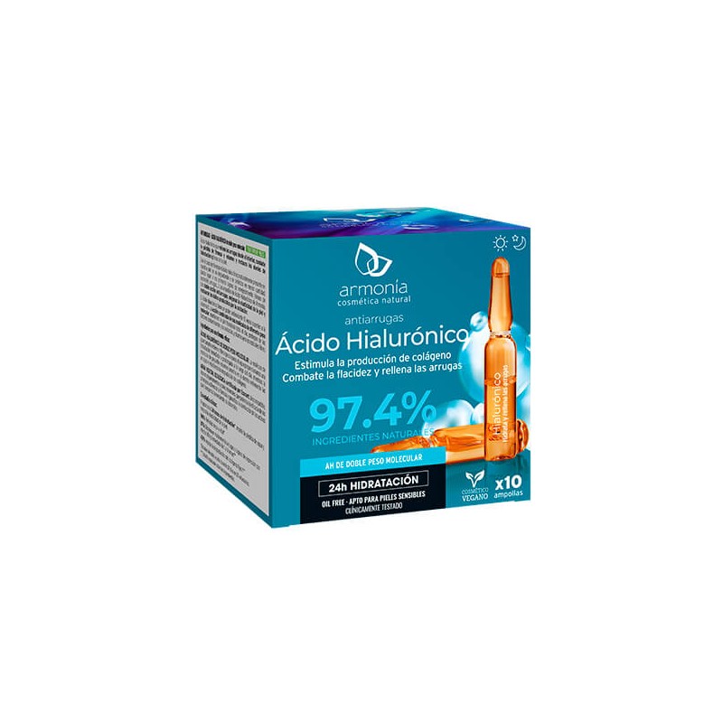 Con el paso del tiempo el ácido hialurónico naturalmente presente en nuestra piel se va degradando y se sintetiza en menor cantidad, dando lugar a los primeros signos de envejecimiento (líneas de expresión, arrugas…). Las ampollas de Ácido Hialurónico de Armonía, con doble acción antiarrugas, mejoran la elasticidad de la piel y restauran los daños producidos por la oxidación.
