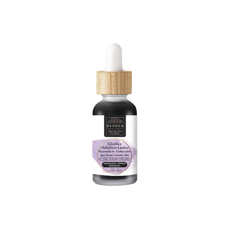 El ultra serum peeling está formulado con ingredientes activos como Alpha-Hidroxiacidos, Beta- Hidroxiacidos, niacinamida 4%, charcoal powder que actúan en tu piel favoreciendo la renovación celular de capas superiores de esta, a través de la exfoliación, y la eliminación de imperfecciones de puntos negros o acné y manchas producidas por este. Además, a su vez, calma cualquier irritación producida gracias al agua ter- mal, aloe vera y lavanda entre otros. Con más de un 92% de ingredientes de origen natural. De textura suave, fresca, apto para pieles con imperfecciones o grasas