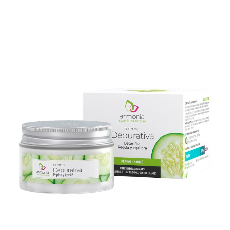 Crema Depurativa a base de pepino y karité. El pepino, con propiedades depurativas, regula las secreciones grasas de las glándulas sebáceas, eliminando las impurezas, a la vez que aclara la piel. La crema Depurativa, de textura ligera y calmante, detoxifica y restaura el equilibrio de las pieles grasas y con tendencia acnéica. Enriquecida con karité, regenera y repara pequeñas marcas y cicatrices.