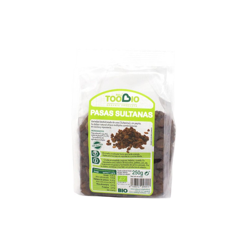 Variedad deshidratada de uvas (sultanina), sin pepita. Su dulzor natural ofrece múltiples combinaciones en cocina y repostería.Composición de Pasas Sultanas 250 grs.