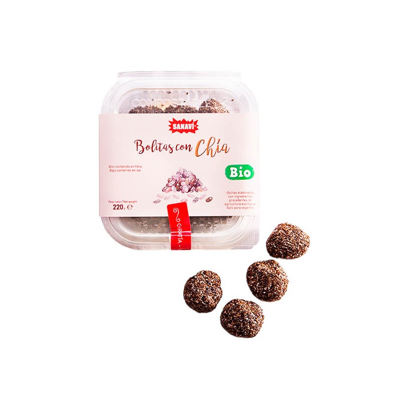 Bolitas de chía elaboradas con ingredientes procedentes de la agricultura ecológica. Apto para veganos.