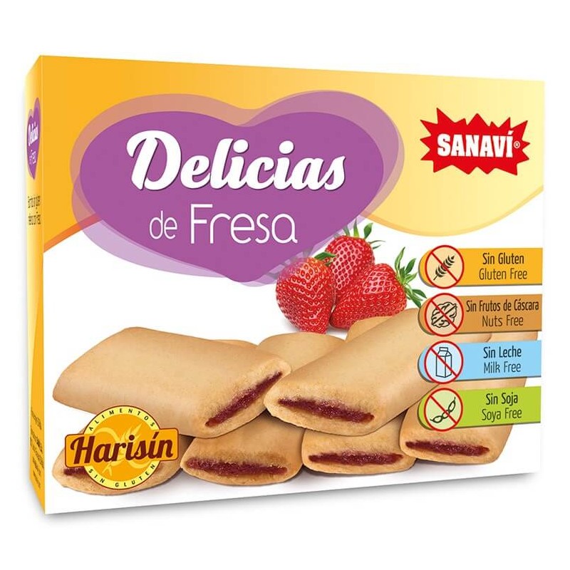 Las DELICIAS de fresa HARISIN son unas exquisitas barritas sin gluten, rellenas de mermelada de fresa, especialmente elaboradas para incluir en dietas sin gluten y aportar un alimento lleno de energía y con el mejor sabor. Apto para celíacos