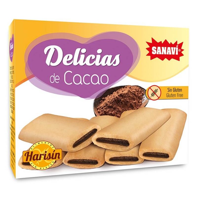 Las DELICIAS de cacao HARISIN son unas exquisitas barritas sin gluten, rellenas de auténtica crema de cacao con avellanas, especialmente elaboradas para incluir en dietas sin gluten y aportar un alimento lleno de energía y con el mejor sabor. Apto para Celíacos