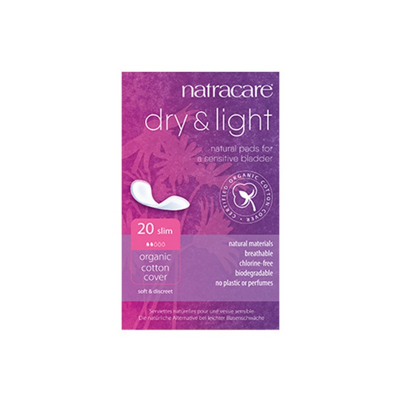 Compresas naturales y absorbentes. Las compresas Natracare Dry & Light son absorbentes y cómodas, y no contienen los plásticos y perfumes habituales que se encuentran en la mayoría de los productos para la incontinencia.
