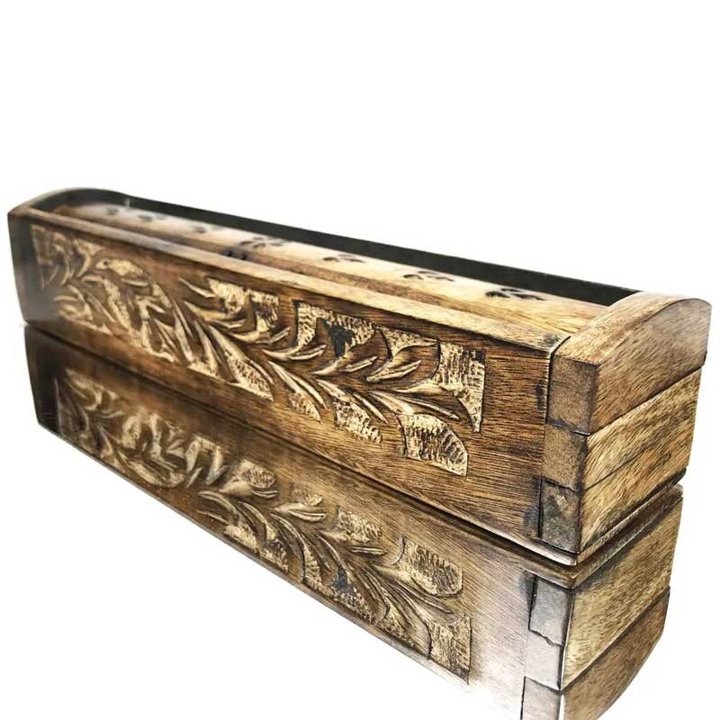 Incensario Baúl de Madera, para incienso en sticks y conos. Tiene la tapa corredera, y tiene un compartimento para almacenar los inciensos en sticks. En el lateral tiene decoraciones florales grabadas.