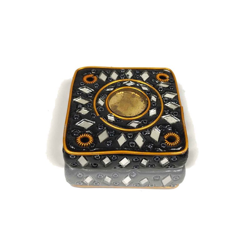 Es un Incensario, que puede soportar sticks y conos. Está recubierto por pintura y textura lacada, con cristales de distintos colores. Son de gran variedad cromática opaca, y pueden variar de color.