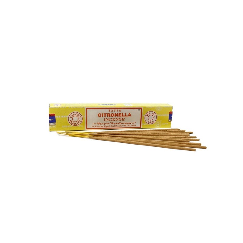 Incienso de Citronela Satya. Este Incienso de Citronella es muy util como antimosquitos y para dar un buen ambiente al hogar. Enciende una varita de incienso Satya y espera que se desprendan estos aromas brillantes y energizantes. Estos inciensos Satya son enrollados a mano en la India con los extractos mas puros y finos de aceites perfumados, extraídos de manera natural. Este aroma crea un ambiente maravilloso en cualquier casa o negocio.
