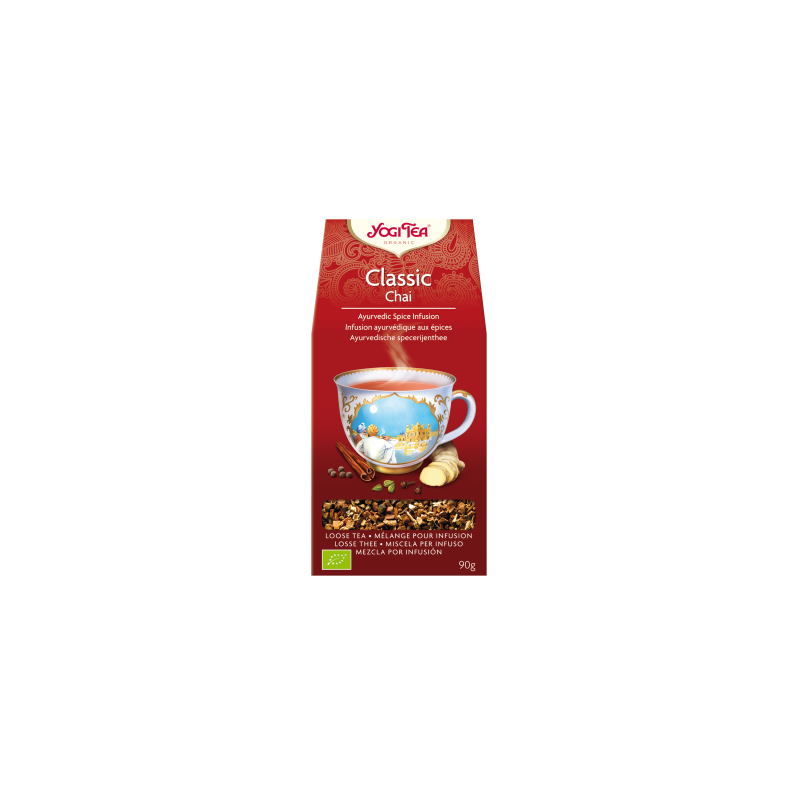 YOGI TEA® Classic es la infusión que Yogi Bhajan servía originalmente a sus alumnos de yoga. La mezcla única que combina las especias ayurvédicas tradicionales: canela, cardamomo, jengibre, clavo y pimienta negra. Reconfortante, relajante, delicioso, picante y maravilloso. El más disfrutado en la tradición india, endulzado y con un poco de leche, animal o vegetal. La esencia de esta infusión es: Comodidad y abundancia.Composición de CLASSIC 90 Gr. BIO