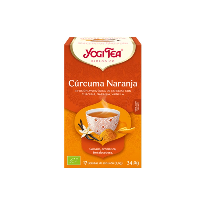 La cúrcuma es la estrella de esta infusión. Sabrosa y suave a la par, el Cúrcuma Naranja de YOGI TEA® une lo mejor de dos mundos: La cúrcuma, fuerte, dorada y brillante se une al afrutado sabor de la naranja. Un toque de vainilla dulce seduce el paladar. Una infusión para disfrutar del día con toda su plenitud. Sabrosa también ligeramente endulzada y con leche/una variante vegana. La esencia de esta infusión es: "Afronta el día con serenidad."Composición de CURCUMA NARANJA 17 FILTROS BIO