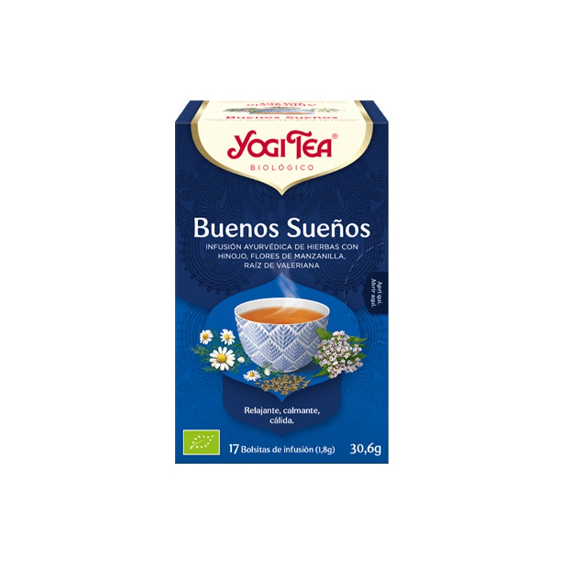 Relajarse con una taza de YOGI TEA® Buenas Noches al atardecer es una estupenda forma de relajarse al final del día. La mezcla de camomila, lavanda, nuez moscada y raíz de valeriana te ayuda a dejar atrás el cansancio y las preocupaciones del día. El dulzor del hinojo te ayuda a dejar de darle vueltas a las cosas. Cuando estamos relajados, nos fijamos en las cosas bonitas de la vida. La esencia de esta infusión es: Relajación. Tiempo para mí.Composición de BUENAS NOCHES BUENOS SUEÑOS 17 FILTROS BIO