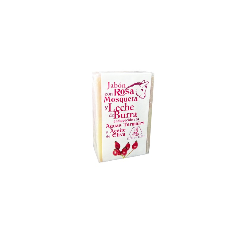 Jabón Artesano con Rosa Mosqueta y Leche de Burra, enriquecido con Aguas Termales y Aceite de Oliva.