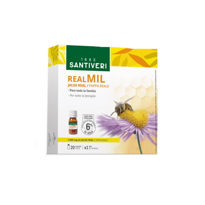 Cada vial contiene 333 mg de jalea real liofilizada (equivalentes aproximadamente a 1.000 mg de jalea real fresca).Composición de Realmil 20 ampollas