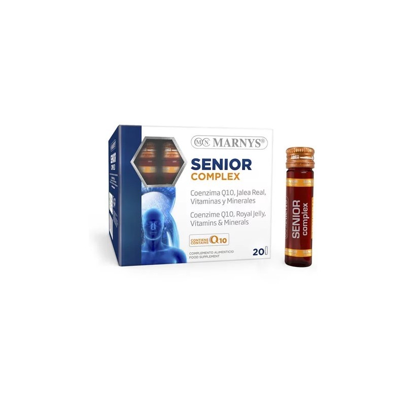 MARNYS® Senior Complex es una exclusiva asociación de Coenzima Q10, Jalea Real, minerales, complejo B y vitaminas A, C, D y E que armoniza la nutrición durante el envejecimiento. MARNYS® Senior Complex es el único producto del mercado con la mayor concentración de CoQ10 (110 mg) en presentación liquida que además proporciona una elevada biodisponibilidad de CoQ10.
